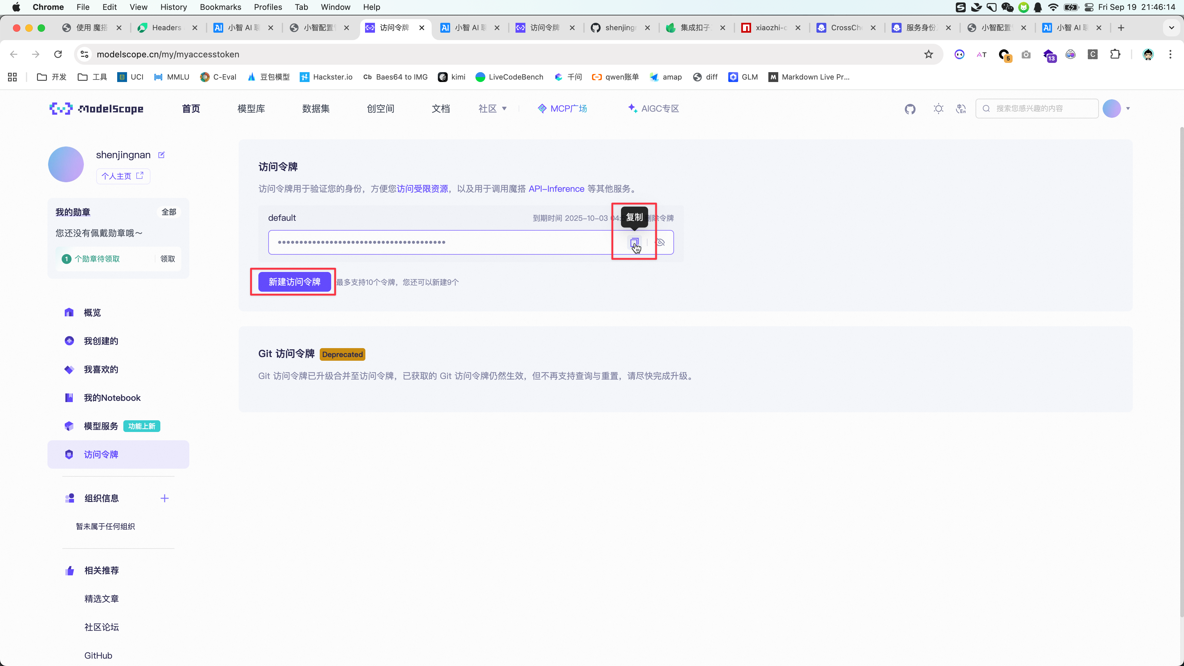 如果还没有访问令牌,可以点击左下角的 新建访问令牌 按钮